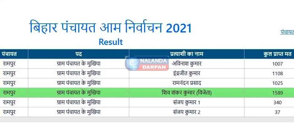 शिव शंकर को जहाँ 1589 वोट मिले हैं, वहीं इंद्रजीत को 1108 वोट मिले हैं। वहीं मुखिया प्रत्याशी अविनाश कुमार को 1007, रामनंदन प्रसाद को 1025, संजय कुमार-1 को 340 और संजय कुमार-2 को 37 वोट मिले हैं।
