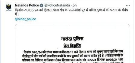 फिलहाल पुलिस पीड़ित बच्ची के परिजन का विधिवत फर्द बयान लेकर हिलसा थाना कांड सं0 305/24 दिनांक 10/05/24 धारा 376 (AB) भादवि एवं 4 / 8 पोक्सो एक्ट के अंतर्गत कांड दर्ज किया गया।